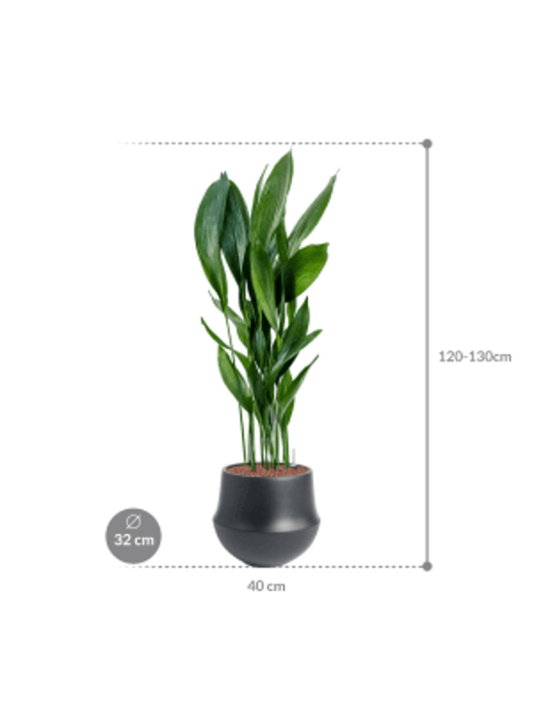 De Aspidistra elatior is een zeer bestendige groene plant die populair is vanwege zijn vermogen te overleven onder moeilijke omstandigheden. Hij heeft brede donkergroene bladeren die oprijzen uit de basis van de plant, groeiend tot een gemiddelde hoogte van 90 cm. Het is een trage groeier en bloeit zelden, maar als het doet zijn de bloemen klein en paarsachtig zwart en groeien ze aan de basis van de plant.