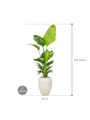 De Strelitzia nicolai is een grote, snelgroeiende kamerplant die kan uitgroeien tot wel zes meter hoog. De plant kenmerkt zich door zijn grote, bananenbladachtige, glanzende groene bladeren. Daarnaast is de plant bekend om zijn opvallende bloemen, die lijken op de kop van een paradijsvogel, bestaande uit donkerblauwe en witte bloemdekbladen. Echter, bij kamerplanten laten deze bloemen vaak op zich wachten.