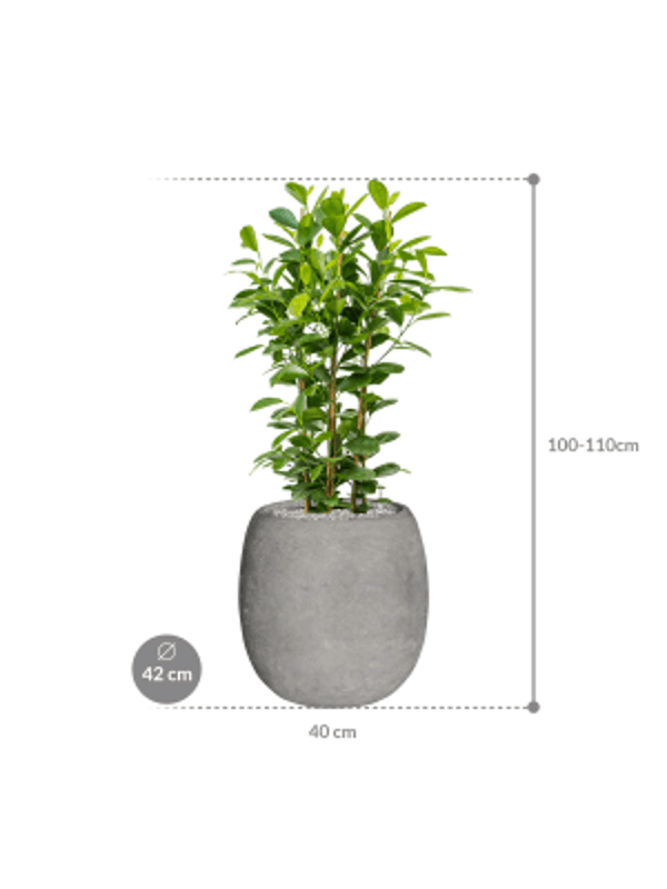 Deze combinatie is opgemaakt met een grondplant, afgevuld met Vulkastrat en is voorzien van een watermeter. Vulkastrat absorbeert meer water dan gewone aarde en geeft het geleidelijk af aan de wortels.