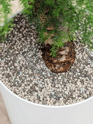 Deze combinatie is opgemaakt met een grondplant, afgevuld met Vulkastrat en is voorzien van een watermeter. Vulkastrat absorbeert meer water dan gewone aarde en geeft het geleidelijk af aan de wortels.