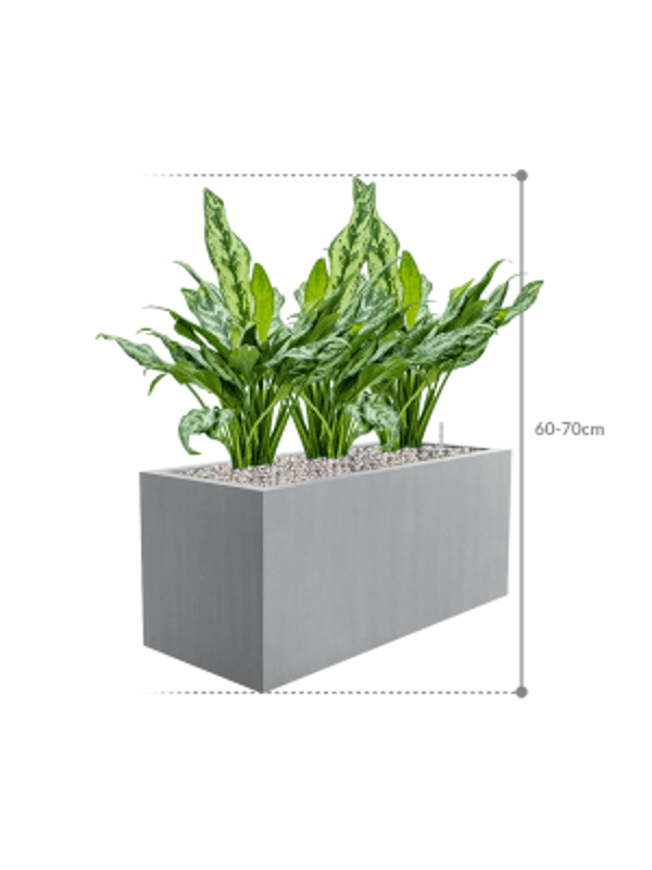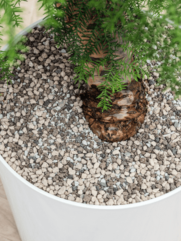 Deze combinatie is opgemaakt met een grondplant, afgevuld met Vulkastrat en is voorzien van een watermeter. Vulkastrat absorbeert meer water dan gewone aarde en geeft het geleidelijk af aan de wortels.
